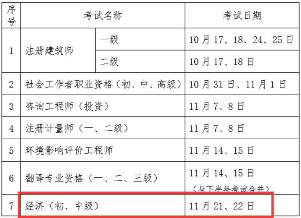 中国人事考试网官宣:推迟的考试已公布准确考试时间!人事考试网终于公布消息!中级经济师等因疫情推迟的考试终于公布准确考试时间啦! 关于2020年度注册建筑师等职业资格考试日期调整的通告 根据新冠肺炎疫情防控进展情况,经商有关部门,原计划于今年上半年举行的2020年度注册建筑师等职业资格考试,调整至今年下半年举行;原计划于10月31日、11月1日举行的2020年度经济专业技术资格考试(初、中级),调整至11月21、22日举行。具体安排如下: 上述职业资格考试报名安排等具体事项,请关注本网站和当地人事考试机构网站通知。 人力资源和社会保障部人事考试中心 2020年6月10日